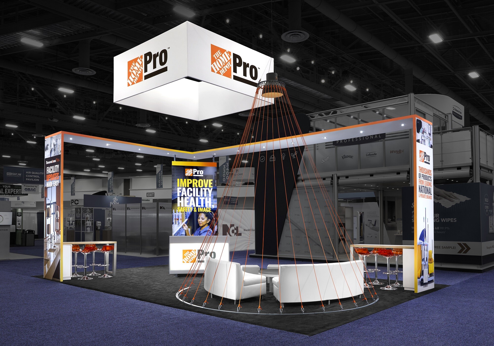 Since 2019, Steelhead has created innovative and diverse environments at five different marquee events. Exhibit footprints have ranged from dimensions as small as 20 x 20 at the IHG Americas Investors Leadership Conference, to 40 x 40 at NAA Apartmentalize, to as large as 60 x 20 at the Choice Hotels Annual Convention. And as of late 2020, HD Supply announced some exciting news by becoming part of The Home Depot® corporation, which they proudly showcased via a 20x30 footprint at ISSA 2021.